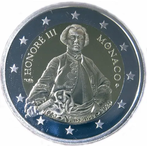 The design shows the effigy of Prince Honoré III. At the left is the inscription ‘HONORÉ III’ and at the right the name of the issuing country ‘MONACO’. At the bottom, in semi-circle, is the inscription ‘1720 – Naissance – 2020’. The coin’s outer ring depicts the 12 stars of the European flag. |