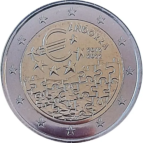 Popis líce The different shapes and sizes of the puzzle pieces depicted in the lower part of the design symbolize the Principality of Andorra and the countries belonging to the European Union. In the upper part of the design, the stars encircling the symbol of the common European currency represent that they are all part of the euro universe. Coin’s outer ring depicts the 12 stars of the European flag.