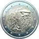 The design is a mix of two major elements of the Erasmus programme: the original intellectual inspiration, Erasmus himself, and the allegory of its influence over Europe. The first one is symbolised by one of the most known depiction of Erasmus. The second one is symbolised by a beam of links going across the coin from a beacon to another, representing the numerous intellectual and human exchanges between the European students. As a reference to Europe, some of these links form other stars, born from the synergy between the countries. The figure 35, for 35th anniversary comes out from the stars in a contemporary graphical style. The outer ring depicts the twelve stars of the European flag. |