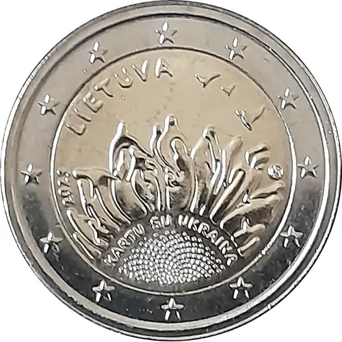 | Descripción del anverso | In the center of the national side (obverse) of the coin is a stylized sunflower, the petals of which are like silhouettes of people holding hands, hugging, protecting each other, embodying unity, support, and the strength of being together. The sunflower is composed by artistic means as if the rising sun is the hope of a new beginning, the birds are freedom, hope and courage, it is like people rising above the circumstances, never putting up with the imposed will, it is an allusion to people who sacrificed their lives, flying away from their souls. The composition also includes the inscriptions `Lithuania`, `Together with Ukraine`, year of issue 2023, the logo of the producer UAB `Lietuvos monetų kalyklos`, 12 EU stars arranged in a circle. |