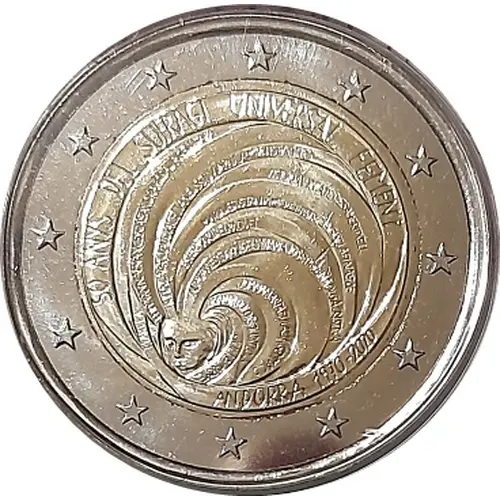 Female face inside a wrapper of endless moving lines. These lines are formed by female names in Catalan language close together, making it difficult to read them individually, as a tribute to solidarity of women in the fight for their rights. There is one repeated name only, that of ‘VICTORIA’ and symbolises the victory of gaining the right to vote. Coin’s outer ring depicts the 12 stars of the European flag. |