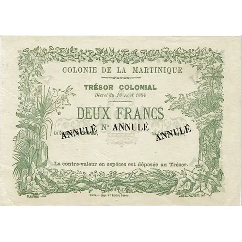 | Opschrift voorzijde | COLONIE DE LA MARTINIQUE TRÉSOR COLONIAL (Décret du 18 Août 1884) DEUX FRANCS La contre-valeur en espèces est déposée au Trésor. CLAVERIE . INV. PARIS. - Imp. Ve Éthiou Pérou. BESCHRER. SC. (Translation: Colony of Martinique Colonial Treasury (Decree August 18, 1884) Two Francs The cash equivalent is deposited in the Treasury.) |
