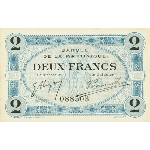 BANQUE DE LA MARTINIQUE DEUX FRANCS 1915 B. ARNAUD - GRAVEUR LYON - PARIS (Translation: Bank of Martinique Two Francs 1915 B. Arnaud - Engraver) |