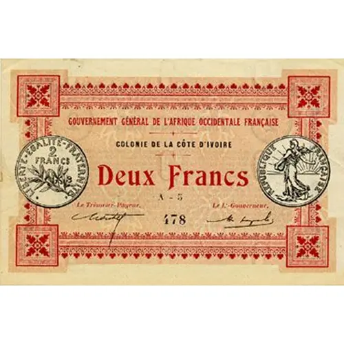 GOUVERNEMENT GENERAL DE L`A.O.F. COLONIE DE LA CÒTE D`IVOIRE DEUX FRANCS |