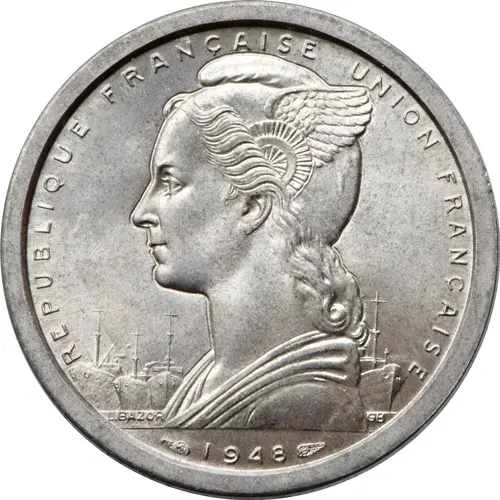 | Opis líce | REPUBLIQUE FRANÇAISE UNION FRANÇAISE L.BAZOR GB 1948 (Translation: French Republic French Union) |