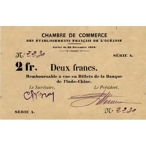 | Opis líce | CHAMBRE DE COMMERCE DES ÉTABLISSEMENTS FRANÇAIS DE L`OCÉANIE Arrête du 29 December 1919. Deux francs. Remboursable à vue en billets de la Banque de l`Indo-Chine SERIE A. (Translation: Chamber of Commerce of the French Establishments in Oceania Order of December 29, 1919 Two francs Reimbursable at sight in Bank of Indochina banknotes) |