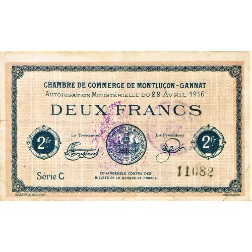 | Obverse lettering | CHAMBRE DE COMMERCE DE MONTLUÇON - GANNAT Autorisation ministérielle du 28 avril 1916 DEUX FRANCS Le Trésorier Le Président Série C 11082 HERBIN & BOUCHÉ MONTLUÇON |