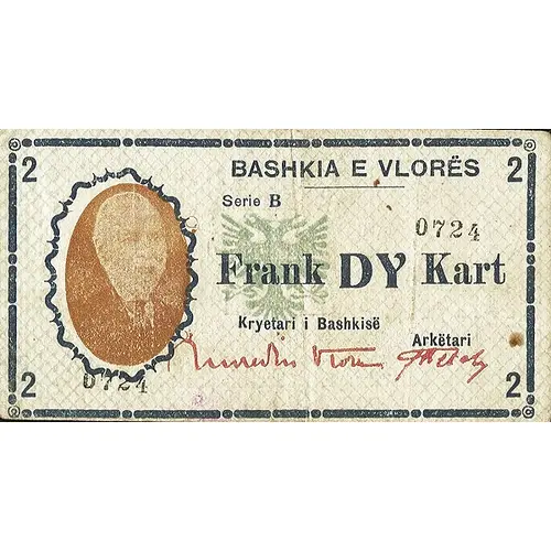 | Obverse lettering | BASHKIA E VLORËS Frank DY Kart (Translation: Municipality of Vlorë, Two Frank) |