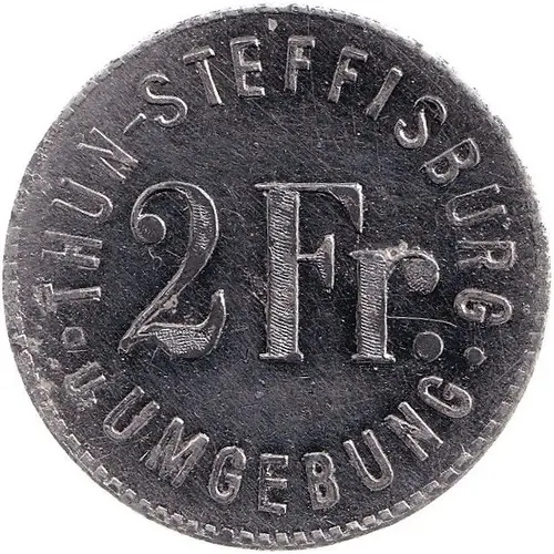 | Obverse lettering | THUN-STEFFISBURG UMGEBUNG 2 Fr. (Translation: Thun-Steffisburg and surroundings. Cooperative.) |