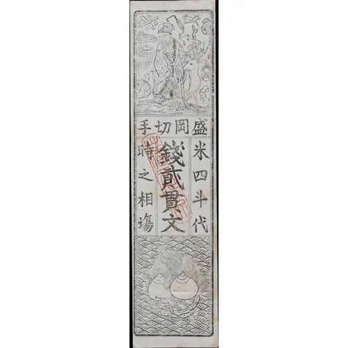 توضیحات روی اسکناس Black print; red stamp. Full-length figure of Jurōjin facing half left, standing, holding staff in left hand and rigid fan in right hand, accompanied by deer facing right looking left to the right behind, surrounded by Fundō, Cintāmaṇi, Uchide-no-kozuchi, and various auspicious objects, at the top. several text boxes in center. Turtle front facing, carrying Cintāmaṇi, on waves background, at bottom. Vertical inscription in Chinese seal script overstamped diagonally in the center.