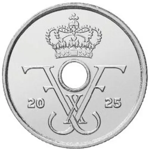 | توضیحات پشت سکه | Value in the top, hole at center and country name in bottom. At the left and right, the new flower like symbol for Amalienborg Castle, to symbolise the Royal House and the people, as a gathering point. |