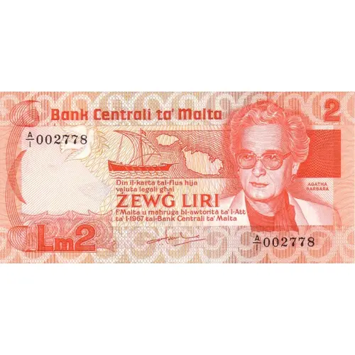 | نوشتههای روی اسکناس | Bank Centrali ta’ Malta Din il-karta tal-flus hija valuta legali għal ŻEWĠ LIRI f`Malta u maħruġa bl-awtorità ta’ l-Att ta’ l-1967 tal-Bank Centrali ta’ Malta (Translation: Central Bank of Malta, This banknote is legal tender for Two Liri in Malta and issued with the authority of the Central Bank of Malta Act of 1967) |