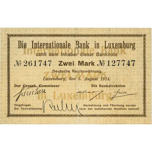 | Legenda awersu | Die Internationale Bank In Luxemburg zahlt dem Inhaber dieser Banknote ZWEI MARK Deutsche Reichswäehrung Luxemburg, den 5. August 1914. Nachahmung und Fälschung werden nach den bestehenden Gesetzen bestraft. (Translation: International Bank of Luxembourg Pays to the owner of this banknote Two Mark German Empire Currency Luxembourg, August 5, 1914. Imitation and counterfeiting will follow punished under existing laws.) |