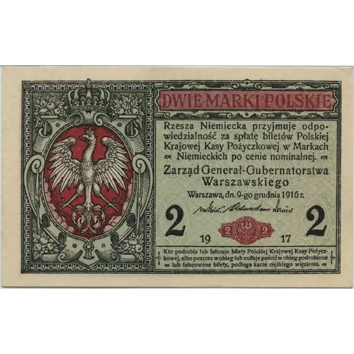 | Obverse lettering | DWIE MARKI POLSKIE Rzesza Niemiecka przyjmuje odpo- wiedzialność za spłatę Biletów Polskiej Krajowej Kasy Pożyczkowej w Markach Niemieckich po cenie nominalnej. Zarząd Generał-Gubernatorstwa Warszawskiego Warszawa, dn. 9-go grudnia 1916r. Kto podrabia lub fałszuje bilety Polskiej Krajowej Kasy Pożycz- kowej, albo puszcza w obieg lub usiłuje puścić w obieg podrobione lub fałszowane bilety, podlega karze ciężkiego więzienia. (Translation: Two Polish Marks The German Reich holds responsibility for repayment of the Loan Bank tickets in German Marks for face value. Management general of Warsaw’s governorship Warsaw day 9th December 1916 Those who counterfeit or forge notes of the Polish State Loan Bank, or circulate or attempt to circulate counterfeit or forged notes are punishable by severe imprisonment.) |