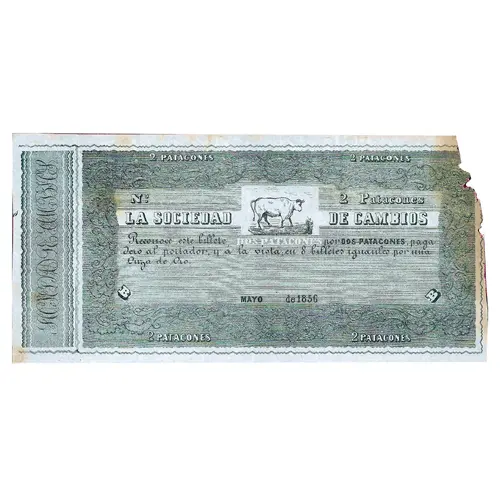 SOCIEDAD DE CAMBIOS 2 Patacones LA SOCIEDAD DE CAMBIOS Reconoce este billete por DOS PATACONES, paga- dero al portador, y á la vista, en 8 billetes iguales por una Onza de Oro. B MAYO de 1856 (Translation: Exchange Society 2 Patacones The Exchange Society reckons this note for two Patacones, payable to bearer, and at sight, in 8 equal notes for one gold ounce. B May, 1856) |
