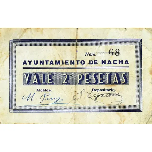 | Legenda awersu | AYUNTAMIENTO DE NACHA VALE 2 PESETAS (Translation: City Council of Nachá Value 2 Pesetas) |