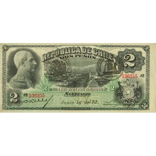 (Translation: Republic of Chile worth Two Pesos convertible into gold or silver by the State in accordance with the Law. SANTIAGO June 16, 1893. American Bank Note Co., New York)