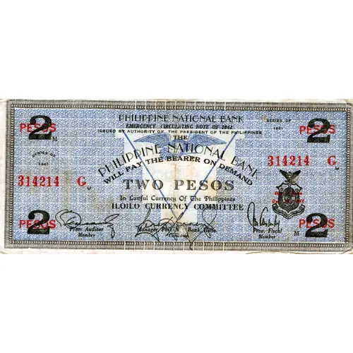 PHILIPPINE NATIONAL BANK EMERGENCY CIRCULATING NOTE OF 1941 THE PHILIPPINE NATIONAL BANK WILL PAY THE BEARER ON DEMAND TWO PESOS IN LAWFUL CURRENCY OF THE PHILIPPINES ISSUED BY AUTHORITY OF THE PRESIDENT OF THE PHILIPPINES ILOILO CURRENCY COMMITTEE |