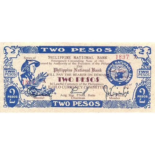 TWO PESOS PHILIPPINE NATIONAL BANK EMERGENCY CIRCULATING NOTE OF 1942 ISSUED BY AUTHORITY OF THE PRESIDENT OF THE PHILIPPINES THE PHILIPPINE NATIONAL BANK WILL PAY THE BEARER ON DEMAND TWO PESOS IN LAWFUL CURRENCY OF THE PHILIPPINES ILOILO CURRENCY COMMITTEE TWO PESOS |
