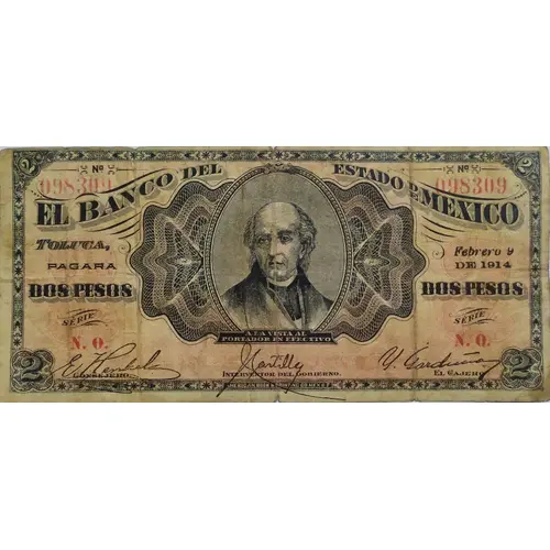 | Chữ khắc mặt trước | El Banco del Estado de Mexico pagará 2 pesos a la vista al portador en efectivo (Translation: The Bank of the State of Mexico will pay 2 pesos on demand to the bearer in cash) |