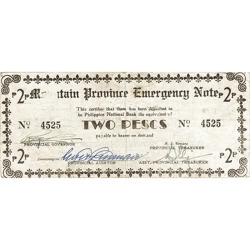 | Opschrift keerzijde | TWO PESOS THIS NOTE IS ISSUED UNDER AUTHORITY OF THE PROVINCIAL BOARD OF THE MOUNTAIN PROVINCE DURING THIS EMERGENCY (RES. NO. 5. 8. 1942) AND IS ONLY GOOD AND NEGOTIABLE WITHIN SAID PROVINCE NOT VALID UNLESS SIGNED BY THE PROVINCIAL GOVERNOR AND PROVINCIAL TREASURER AND COUNTERSIGNED BY THE PROVINCIAL AUDITOR AND SEALD WITH THE OFFICIAL SEAL OF THE MOUTAIN PROVINCE MOUNTAIN PROVINCE EMERGENCY NOTE TWO PESOS |