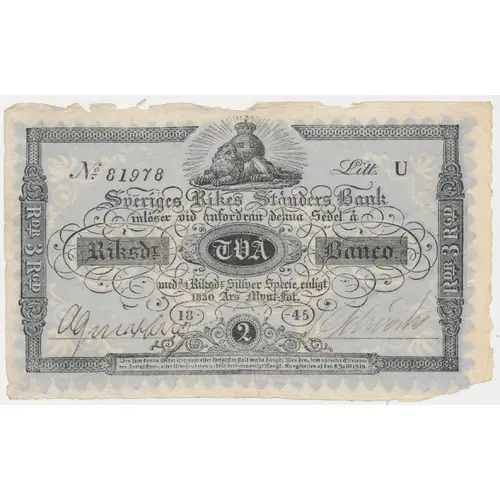 Sveriges Rikes Ständers Bank inlöser vid anfordran denna Sedel å Två Riksdaler Banco med ¾ Riksdr. Silfver Specie enligt 1830 Ård Mynt-fot. Den som denna Sedel efterapar eller förfalskar skall warda hängd. Men den som upptäcker Efteraparen, Förfalskaren eller Utprånglaren undfår belöning enligt Kungl. Kungörelsen af den 7 Julii 1818. (Translation: Sweden`s Estates of the Realm Bank will pay, on demand, for this note Two Riksdaler Banco with ¾ Riksdaler in silver specie according to the Year 1830 coinage standard. Those who mimic of forge this note shall be hanged. However, those who discover mimics, forgers or distributors will recieve reward according to the royal proclomation of the 7th of July 1818.) |