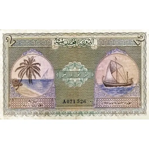 | Descrição do anverso | Multicolour print. Palm tree and dhow at left, dhow at right |