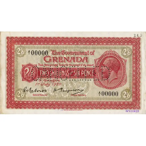 | Obverse lettering | The Government of GRENADA These Notes are Legal Tender for the payment of any amount. 2/6 TWO SHILLINGS AND SIX PENCE St. George`s 1st July 1920 |