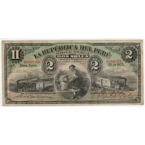 | Obverse lettering | LA REPÚBLICA DEL PERÚ PAGARÁ AL PORTADOR DOS SOLES CONFORME A LO DISPUESTO EN LAS LEYES De 27 De ENERO Y 4 De FEBRERO De 1879 Lima, Junio 30 de 1879 POR LA JUNTA ADMINISTRADORA Y DE VIJILANCIA DE LA EMISION FISCAL American Bank Note Co. New York (Translation: The Republic of Peru Will pay to the bearer Two Soles (Two Suns) Accordingly to stated on Laws from January 27th, & February 4th., 1879 Lima, June 30th., 1879 By Administrative and Oversight Board of Fiscal Issue American Bank Note Co. New York) |