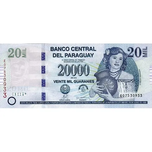 | Obverse lettering | 20 MIL 20 MIL BANCO CENTRAL DEL PARAGUAY EL BANCO CENTRAL DEL PARAGUAY RECONOCE ESTE BILLETE POR 20000 ANO 2015 VEINTE MIL GUARANIES BCP LA MUJER PARAGUAYA GERENTE GENERAL PRESIDENTE ESTE BILETE TIENE CURSO LEGAL Y FUERZA CANCELATORIA ILIMITADA EN TODO EL TERRITORIO DE LA REPUBLICA LEY 489 DEL 29 JUNIO DE 1995. (Translation: 20 thousand Central Bank of Paraguay The Central Bank of Paraguay accept this banknote for year 2013 Twenty Thousand Guaranies BCP the Paraguayan woman This banknote is legal tender and has unlimited validity on all the Republic territory (Law 489 from June 29th., 1995).) |