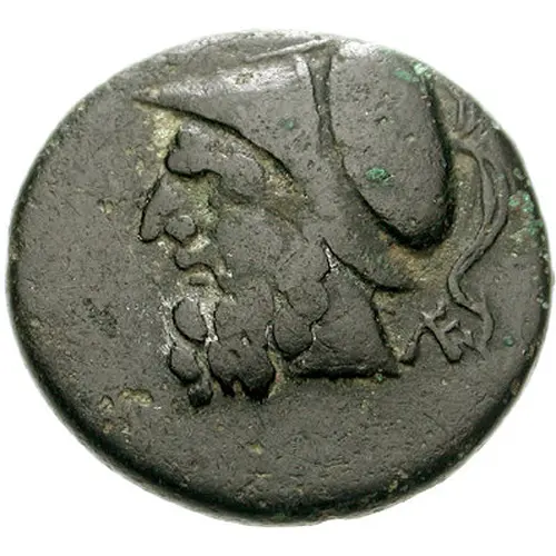 | Obverse description | Bearded head facing left, wearing a Corinthian helmet and ΛE monogram to the right |