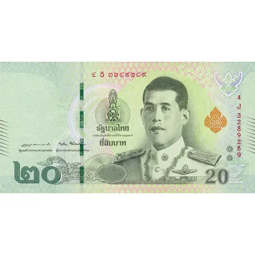 | 正面描述 | Green print; multicolour underprint; red serial numbers; black signatures. Bust of King Vajiralongkorn, in the uniform of the commander of the Royal Thai Air Force, facing slightly left. Crowned `วปร` monograms of him to the left. Perfect registration printed Garuda on upper right corner. Two transparent windows to the left of monograms; the upper one has small multiple embossed `20`; the lower one has yellow `20` in the center; with another transparent `20` below. EURion constellations on upper right of king`s head. Multiple microtexts `20` on the left of king`s neck. Latent number `20` on the left of king`s shoulder. Vertical security thread with repeating `20 BAHT 20 บาท` |