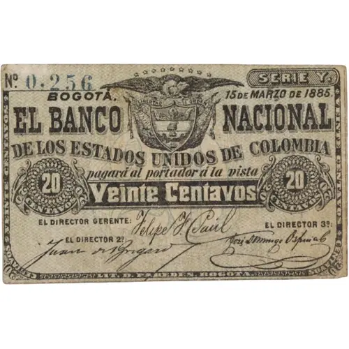 | Légende de l’avers | SERIE Y BOGOTÁ, 15 DE MARZO DE 1885. EL BANCO NACIONAL DE LOS ESTADOS UNIDOS DE COLOMBIA pagará al portador á la vista 20 VEINTE CENTAVOS 20 EL DIRECTOR GERENTE EL DIRECTOR 2º EL DIRECTOR 3º LIT. D. PAREDES, BOGOTÁ (Translation: Series Y Bogota, March 15th., 1885. The National Bank of The United States of Colombia Pay to Bearer at sight Twenty Cents The General Director 2nd. Director 3rd. Director Lithography D. Paredes, Bogota) |