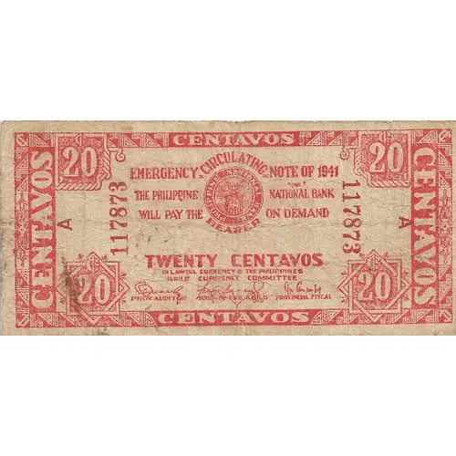 EMERGENCY CIRCULATING NOTE OF 1941 THE PHILIPPINE NATIONAL BANK WILL PAY THE BEARER ON DEMAND TWENTY CENTAVOS IN LAWFUL CURRENCY OF THE PHILIPPINES ILOILO CURRENCY COMMITTEE |