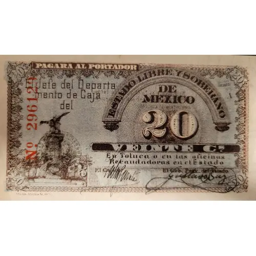 | 正面铭文 | Pagara al portador El jefe del departamento de caja del Estado Libre y Soberano de Mexico 20 veinte Cs En Toluca o en las oficinas recaudadoras en el estado (Translation: Pay to the bearer The head of the accounting department of the Free and Sovereign State of Mexico 20 Twenty Centavos In Toluca or in the collection offices in the state) |