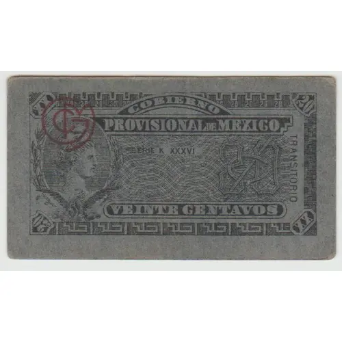 | Legenda do anverso | Gobierno Provisional de Mexico serie K xxxvi transitorio Veinte Centavos |