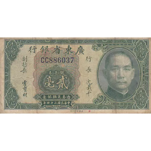 | Надписи лицевой стороны | 行銀省東廣 券毫銀 毫貳 毫銀換兌券憑 年四十二國民華中 司公票鈔國美 (Translation: Kwangtung Provincial Bank Silver cent note 20 Cents Voucher exchangeable for silver cents Year 24 of the Republic of China American Bank Note Company) |