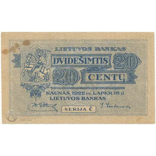| Ön yüz lejandı | LIETUVOS BANKAS 20 DVIDEŠIMTIS CENTŲ KAUNAS, 1922 m. LAPKR 16 d. LIETUVOS BANKAS SERIJA C (Translation: Lithuanian Bank Twenty cents Kaunas, November 16, 1922. Lithuanian Bank Series C) |