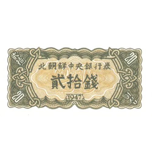 | Obverse lettering | 北朝鮮中央銀行券 貳拾 錢 1947 (Translation: Banknote of the Central Bank of North Korea Twenty Chon) |