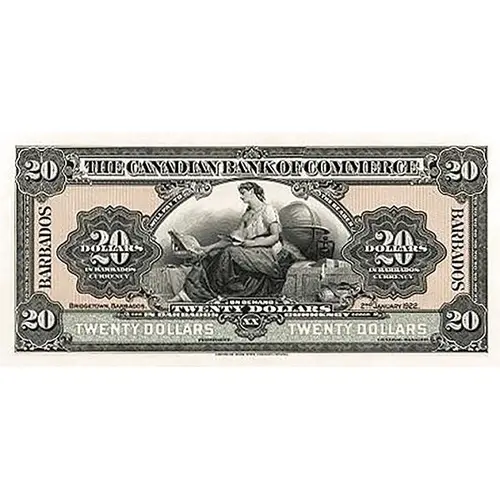 THE CANADIAN BANK OF COMMERCE BARBADOS 20 DOLLARS IN BARBADOS CURRENCY WILL PAY THE BEARER IN DEMAND TWENTY DOLLARS IN BARBADOS CURRENCY XX 2ND JANUARY 1922 PRESIDENT MANAGER CANADIAN BANKNOTE COMPANY LIMITED 20 |