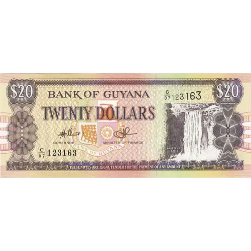 | Obverse lettering | BANK OF GUYANA TWENTY DOLLARS KAIETEUR FALLS THESE NOTES ARE LEGAL TENDER FOR THE PAYMENT OF ANY AMOUNT |