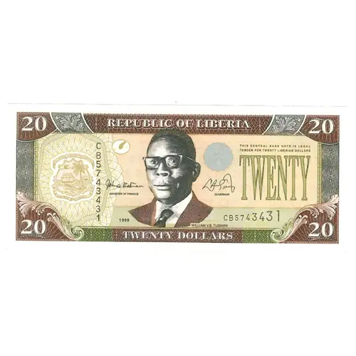 | Légende du revers | REPUBLIC OF LIBERIA 20 TWENTY DOLLARS CENTRAL BANK OF LIBERIA ESTABLISHED 1999 |