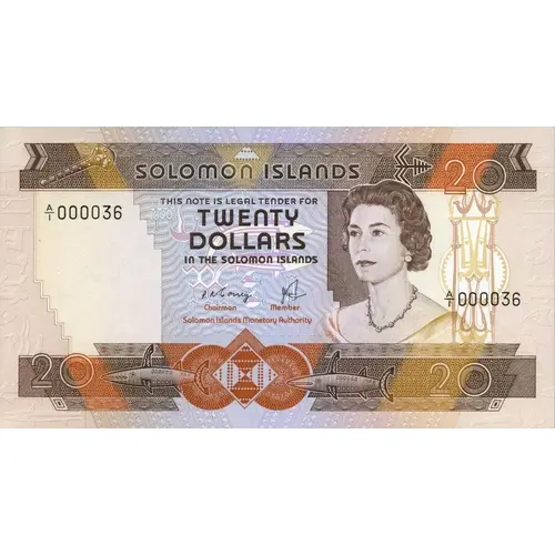 نوشته‌های روی اسکناس SOLOMON ISLANDS THIS NOTE IS LEGAL TENDER FOR TWENTY DOLLARS IN THE SOLOMON ISLANDS CENTRAL BANK OF SOLOMON ISLANDS