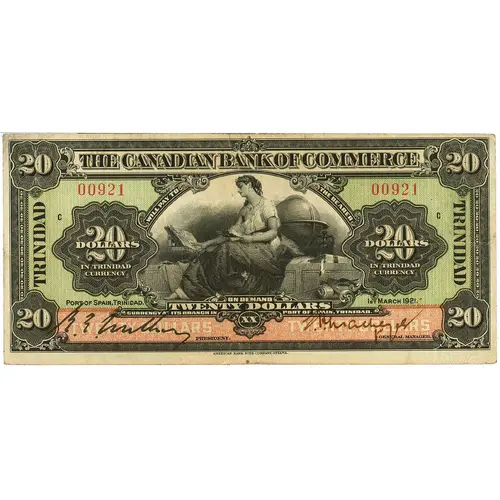 | نوشتههای روی اسکناس | THE CANADIAN BANK OF COMMERCE WILL PAY TO THE BEARER ON DEMAND TWENTY DOLLARS IN TRINIDAD CURRENCY |