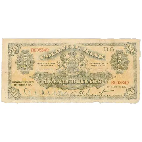 | 表面の銘文 | COLONIAL BANK PROMISES TO PAY THE BEARER ON DEMAND AT ITS OFFICE HERE INCORPORATED BY ROYAL CHARTER 1836 TWENTY DOLLARS GEORGETOWN DEMERARA |