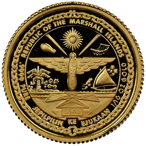 | Legenda awersu | REPUBLIC OF THE MARSHALL ISLANDS .9999 PURE JEPILPILIN KE EJUKAAN 1/1OZ GOLD (Translation: Accomplishment Through Joint Effort) |