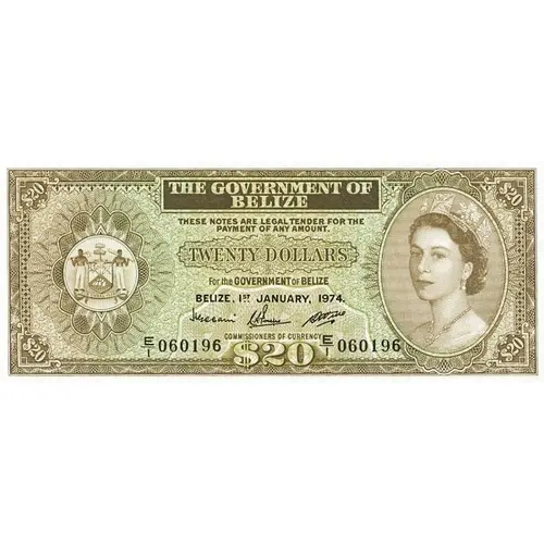 THE GOVERNMENT OF BELIZE THESE NOTES AR LEGAL TENDER FOR THE PAYMENT OF ANY AMOUNT TWENTY DOLLARS For the GOVERNMENT of BELIZE BELIZE, 1st JANUARY, 1976. COMMISSIONERS OF CURRENCY $20 SUB • UMBRA • FLOREO (Translation: I flourish in the shade.) |