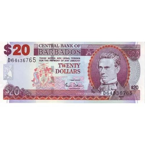 CENTRAL BANK OF BARBADOS THESE NOTES ARE LEGAL TENDER FOR THE PAYMENT OF ANY AMOUNT TWENTY DOLLARS GOVERNOR SAMUEL JACKMAN PRESCOD PRIDE AND INDUSTRY $20 1 MAY 2007 |