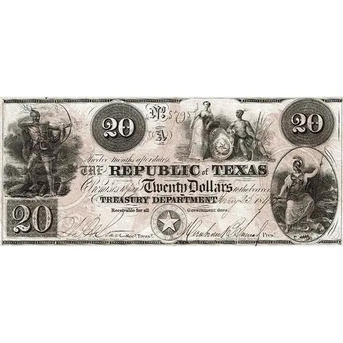 Chữ khắc mặt trước Twelve months after date, THE REPUBLIC OF TEXAS Promises to pay Twenty Dollars to the bearer TREASURY DEPARTMENT Receivable for all Government dues.