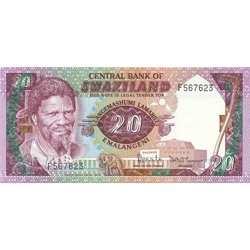 | Obverse lettering | CENTRAL BANK OF SWAZILAND THIS NOTE IS LEGAL TENDER FOR LANGEMASHUMI LAMABILI 20 EMALANGENI |